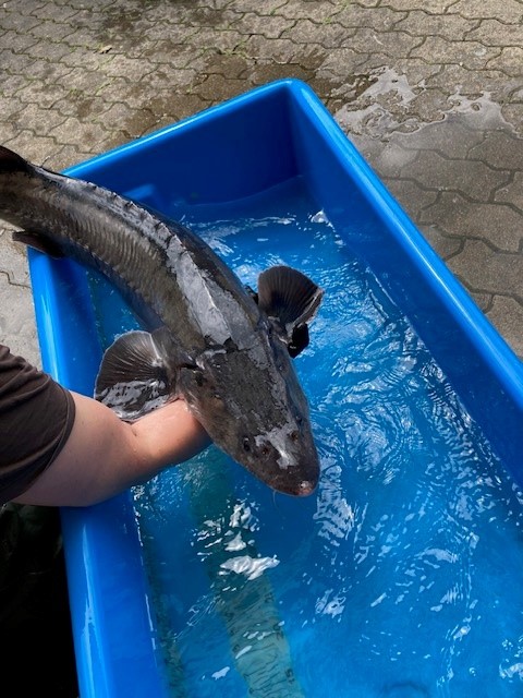 Die Störe schwimmen artgerecht in einem großen Außenbecken. Die Fotos wurden beim kurzen Temperieren der Störe gemacht.